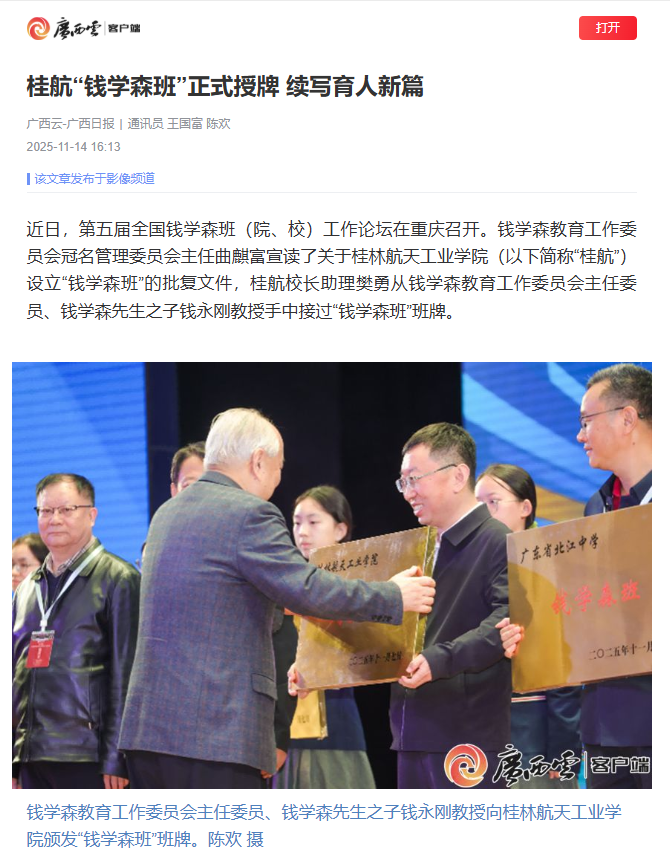 桂航自2024级“钱学森班”正式获批以来,积极遵循钱学森先生“集大成得智慧”的教育理念,依托学校学科优势及航天行业资源,致力于培养具有深厚工科基础、卓越创新能力、广阔发展潜力和高综合素质的高端航天人才。通过一系列富有开创性的探索与实践,桂航在培养新时代航天人才方面取得了显著成效,为我国高等教育领域的人才培养模式改革提供了宝贵的“桂航样本”。
