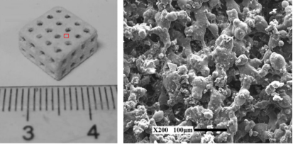 研究了医用脂肪型聚碳酸酯-羟基磷灰石(α-PC/HA)多孔骨骼支架SLS成型,探索α-PC/HA多孔骨骼支架孔隙形成机理及过程中的热力学行为,揭示了材料配比和SLS工艺参数对孔隙度和机械性能的影响规律,成型出人体非承重骨骨骼支架(图1),该成果为本课题在人体骨骼修复体孔隙结构的设计和制备方面奠定了理论基础。