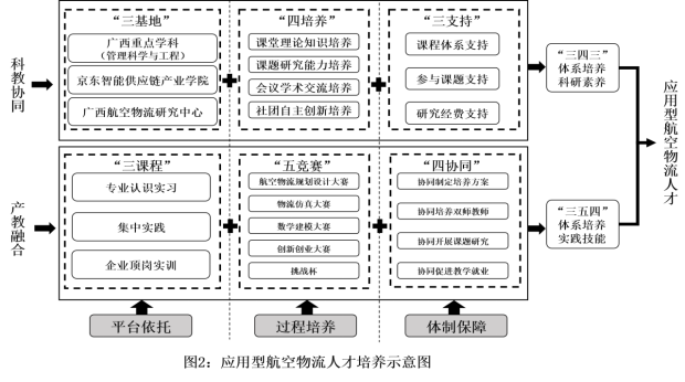 以航空物流人才科研素养和实践技能培养为重点,重构专业知识结构和课程体系,构建了“平台依托、过程培养和体制保障”三位一体的应用型航空物流人才培养体系,见图2。《科教协同、产教融合,培养应用型航空物流人才》获广西教学成果一等奖。