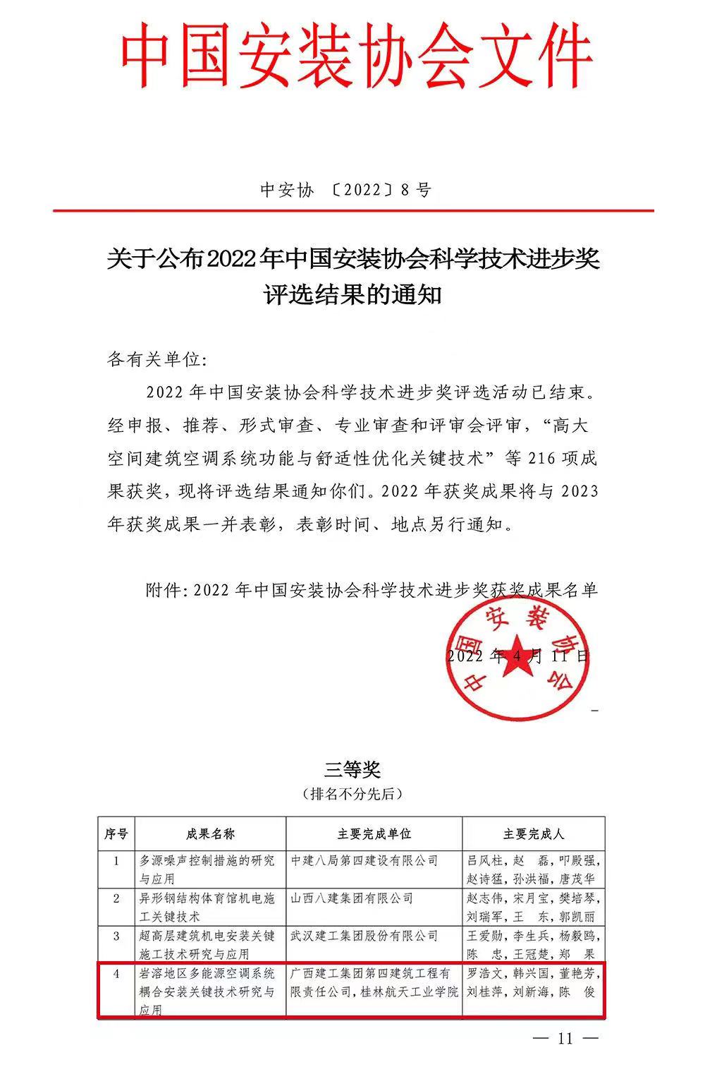 近日,2022年中国安装协会科学技术进步奖公布评选结果,pp电子能源与建筑环境学院教师韩兴国、董艳芳与广西建工集团第四建筑工程有限责任公司联合申报的科研成果《岩溶地区多能源空调系统耦合安装关键技术研究与应用》从全国入选的406项实际工程应用成果中脱颖而出,获得三等奖。