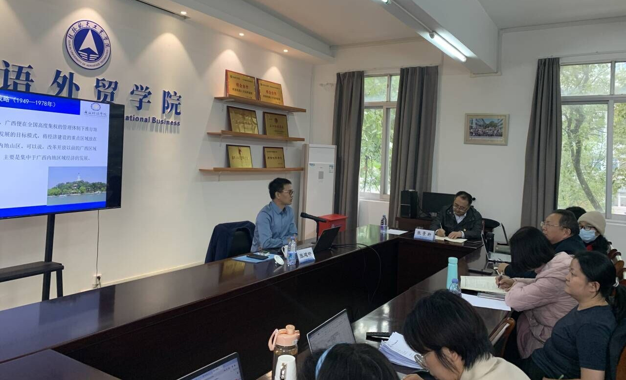 为积极抢抓RCEP、中国—东盟自贸区3.0版、“一带一路”倡议深入建设等重大机遇,进一步凝练打造学校东盟特色,切实提升教师们科研水平,推动学院在服务和融入新发展格局方面展现新作为,12月14日下午,外语外贸学院特邀广西财经学院研究生院院长、博导、广西第十八批“新世纪十百千人才工程”第二层次人选、广西高校高水平创新团队与卓越学者计划人选、广西“海陆经济一体化与海上丝绸之路建设协同中心”副主任张建中教授来校开展题为“‘一带一路’背景下广西区域经济发展战略选择”“国家社科基金申报技巧与体会”的专题讲座。外语外贸学院班子成员、科技创新团队成员、博士教师、副高以上职称教师、国际商务教研室全体教师、管理学院部分博士教师共计60余人参加了此次讲座。