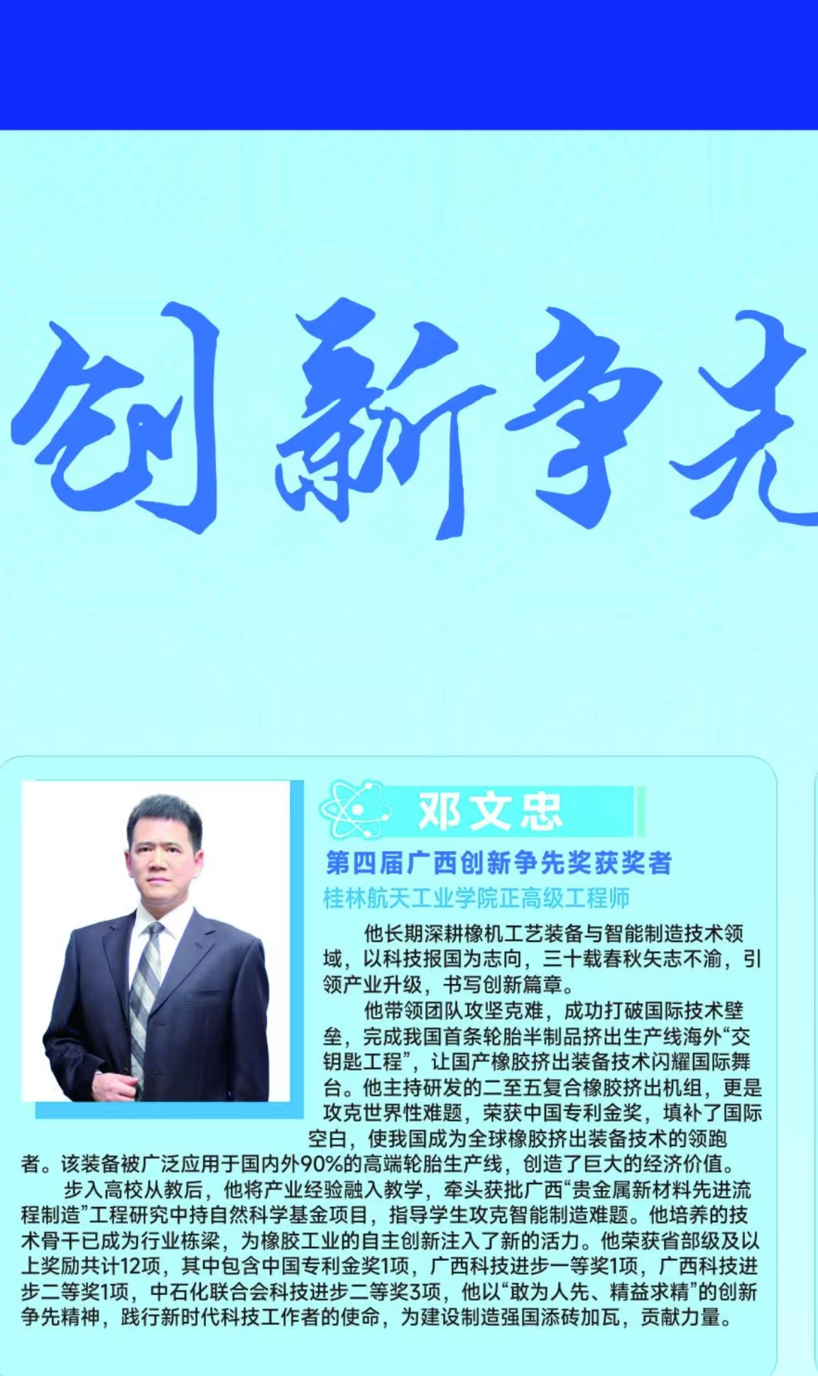 2025年5月29日,在广西科技馆举行的2025年“全国科技工作者日”广西主场活动中,“第四届广西创新争先奖(含广西卓越工程师奖)”颁奖仪式隆重举行。由广西科协主办的这一盛会,旨在表彰在科技创新一线作出突出贡献的科技工作者。学校机电工程学院正高级工程师、著名橡胶装备专家邓文忠教授凭借其在橡胶装备领域的卓越成就,荣获“广西创新争先奖”,为学校科研事业再添荣光,也为广西科技创新注入强劲动力。