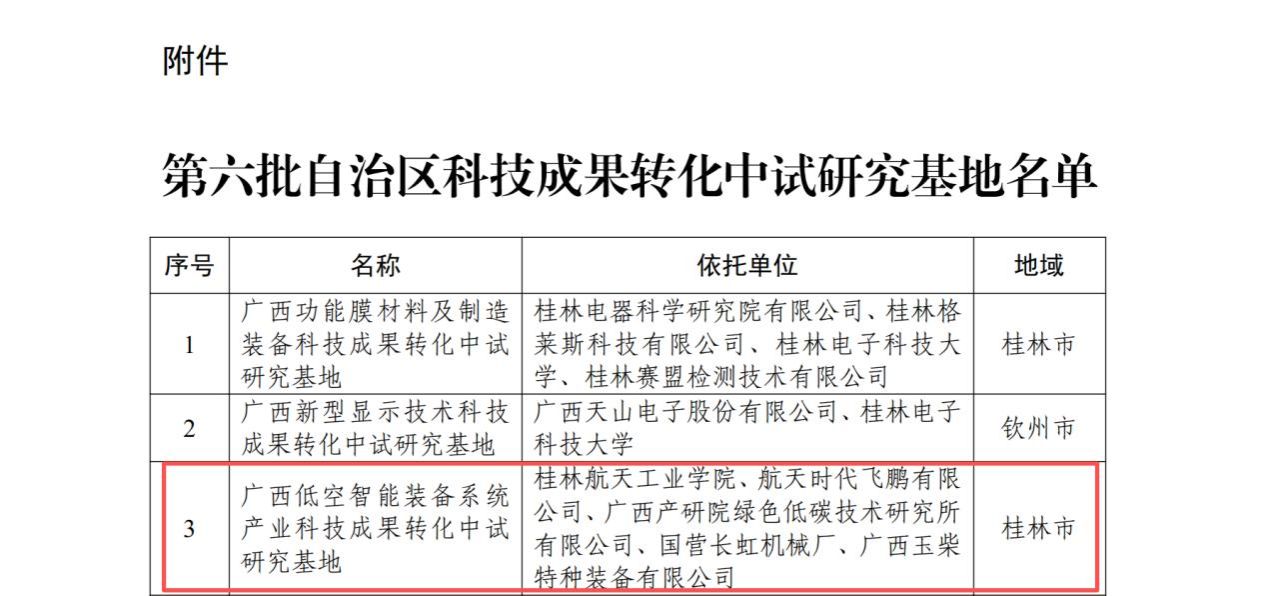 近日,广西壮族自治区科学技术厅正式公布了第六批自治区科技成果转化中试研究基地名单(桂科发〔2025〕413号)。由pp电子牵头,联合航天时代飞鹏有限公司、广西产研院绿色低碳技术研究所有限公司、国营长虹机械厂、广西玉柴特种装备有限公司共同申报的“广西低空智能装备系统产业科技成果转化中试研究基地”成功获批!这是pp电子获批的首个中试研究基地,也是广西第一个低空智能装备领域的自治区级中试研究基地,标志着pp电子在航空航天特色科研成果转化平台建设方面取得了新突破。