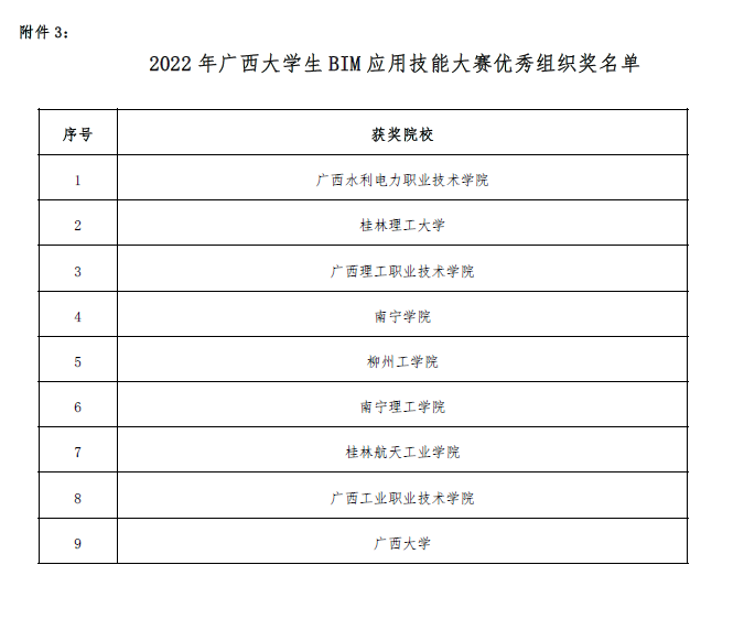 近日,2022年广西大学生BIM应用技能大赛圆满落幕,本次大赛由广西壮族自治区教育厅主办、桂林理工大学和广西本科高校土木、建筑类教学指导委员会承办,深圳市斯维尔科技股份有限公司协办。大赛通过线上线下相结合的方式举行,共有全区43所高校192支参赛团队900多位参赛学生参赛。经过激烈角逐,能源与建筑环境学院选送的4支队伍分别荣获二等奖2项、三等奖2项,学校荣获优秀组织奖。