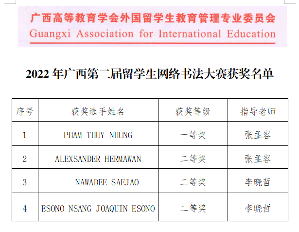 为丰富留学生校园文化生活,营造浓厚的中文学习氛围,激发留学生们书写汉字的热情,感受中国汉字和诗词之美,近日,pp电子组织了境内外四名留学生报名参加了由广西留管学会主办的第二届留学生网络书法大赛。