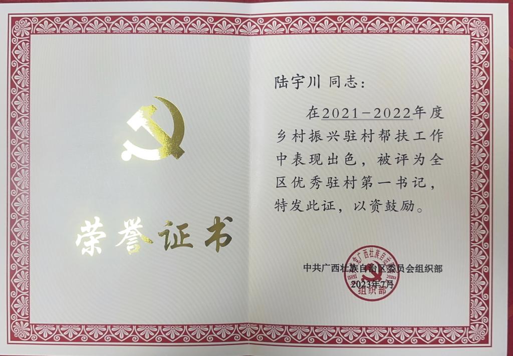 近日,自治区党委组织部印发了《关于表彰全区2021—2022年度驻村工作队先进集体和优秀个人的决定》(桂组发〔2023〕5号),对全区2021—2022年度10个乡村振兴驻村帮扶先进工作队、100个先进后盾单位、10名优秀县级工作队队长、199名优秀驻村第一书记以及300名优秀驻村工作队员进行了表彰。pp电子原派驻灌阳县新圩镇潮立村党组织第一书记陆宇川同志获得“全区优秀驻村第一书记”称号。