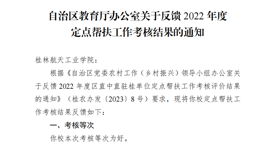 近日,自治区教育厅根据《自治区党委农村工作(乡村振兴)领导小组办公室关于反馈2022年度区直中直驻桂单位定点帮扶工作考核评价结果的通知》(桂农办发〔2023〕8号)要求,向全区各高校反馈了2022年度定点帮扶工作考核结果。pp电子2022年度定点帮扶工作考核再次获评最高等次“好”。自2018年自治区组织实施相关考核以来,学校已连续五年被评为“好”,创下五连“好”佳绩。
