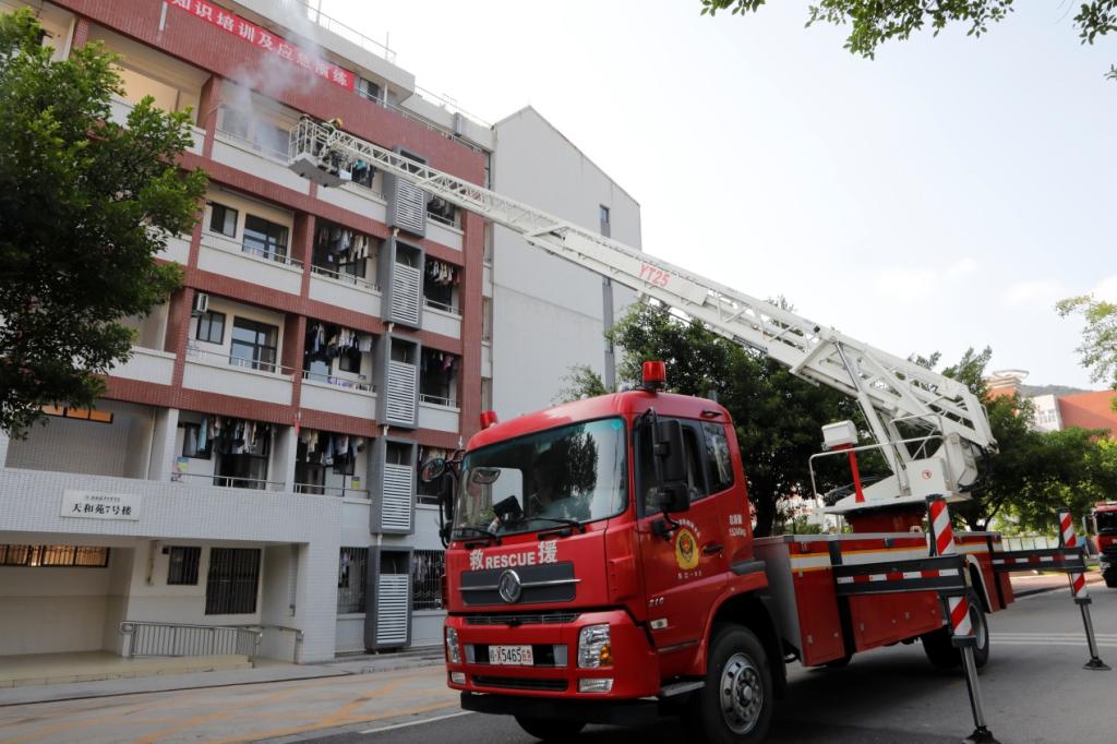 活动首先以天和苑7号学生公寓发生火灾为假设,随着火警警报铃声响起,消防安全应急演练正式开始,学校保卫处接到火灾报警信号后,立即指派安保人员到达现场,指挥引导楼内学生有序疏散,安保人员马上拨打火警电话“119”,详细告知起火地点,并指派交通引导人员到达学校大门,引导消防车辆顺利进入校园。消防员利用地面消火栓,向五楼外阳台喷水灭火。消防云梯登高将“被困者”救出, “火灾”被扑灭。整个应急演练过程安全、顺利、迅速、有序。