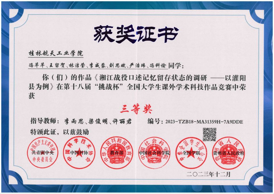 近日,由共青团中央、中国科协、教育部、中国社会科学院、全国学联、贵州省人民政府共同主办的第十八届“挑战杯”全国大学生课外学术科技作品比赛结果正式公布,pp电子再创佳绩,《湘江战役口述记忆留存状态的调研—以灌阳县为例》在第十八届“挑战杯”全国大学生课外学术科技作品竞赛中荣获三等奖。