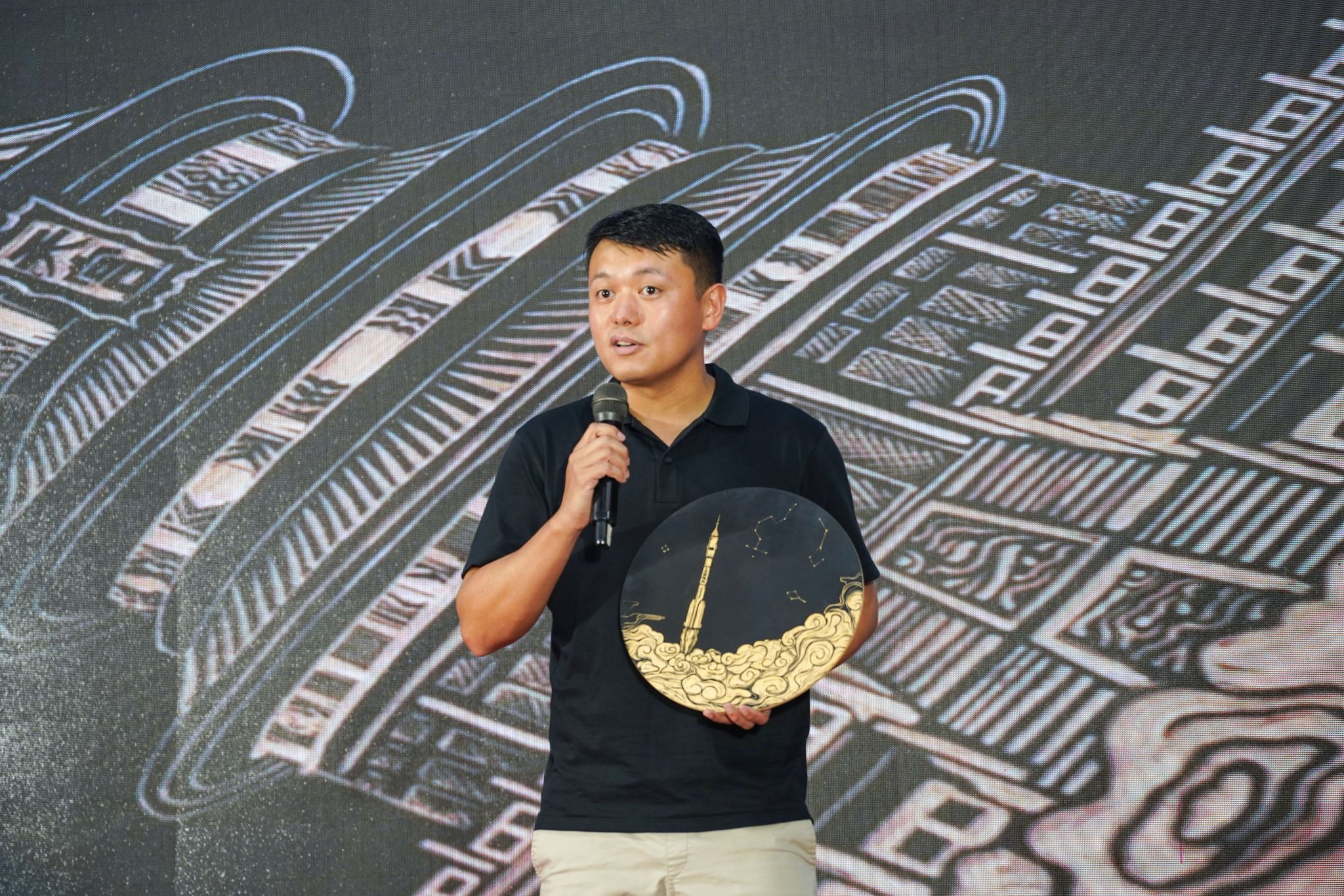 中国工艺美术学会常务理事、云南省木雕协会会长、中国首届木雕艺术大师蒋福生先生现场分享《精神——创造文化的源泉》;中国掐丝珐琅传承人、上海建立梨书院院长魏晖先生,现场展示作品《飞龙在天》;广西岭南印社文化艺术研究院研究员、桂林独秀书画研究院执行院长谭伟成先生带来印章篆刻作品《航天精神铸魂》;非物质文化遗产铜鼓传承人、广西岭南印社副社长刘玉伟先生现场解读《“模与范”—青铜器“铜鼓”的技艺传承》;中国民间文艺家协会会员、广西山歌王于润发先生,献唱山歌《中国科技实力强》。蒋铧、裕笑等七位专家现场众笔合文《飞天梦想、艺航同行》艺术作品。