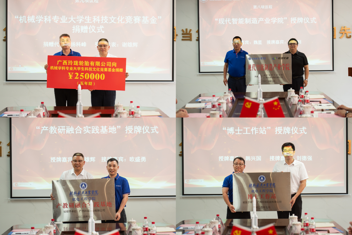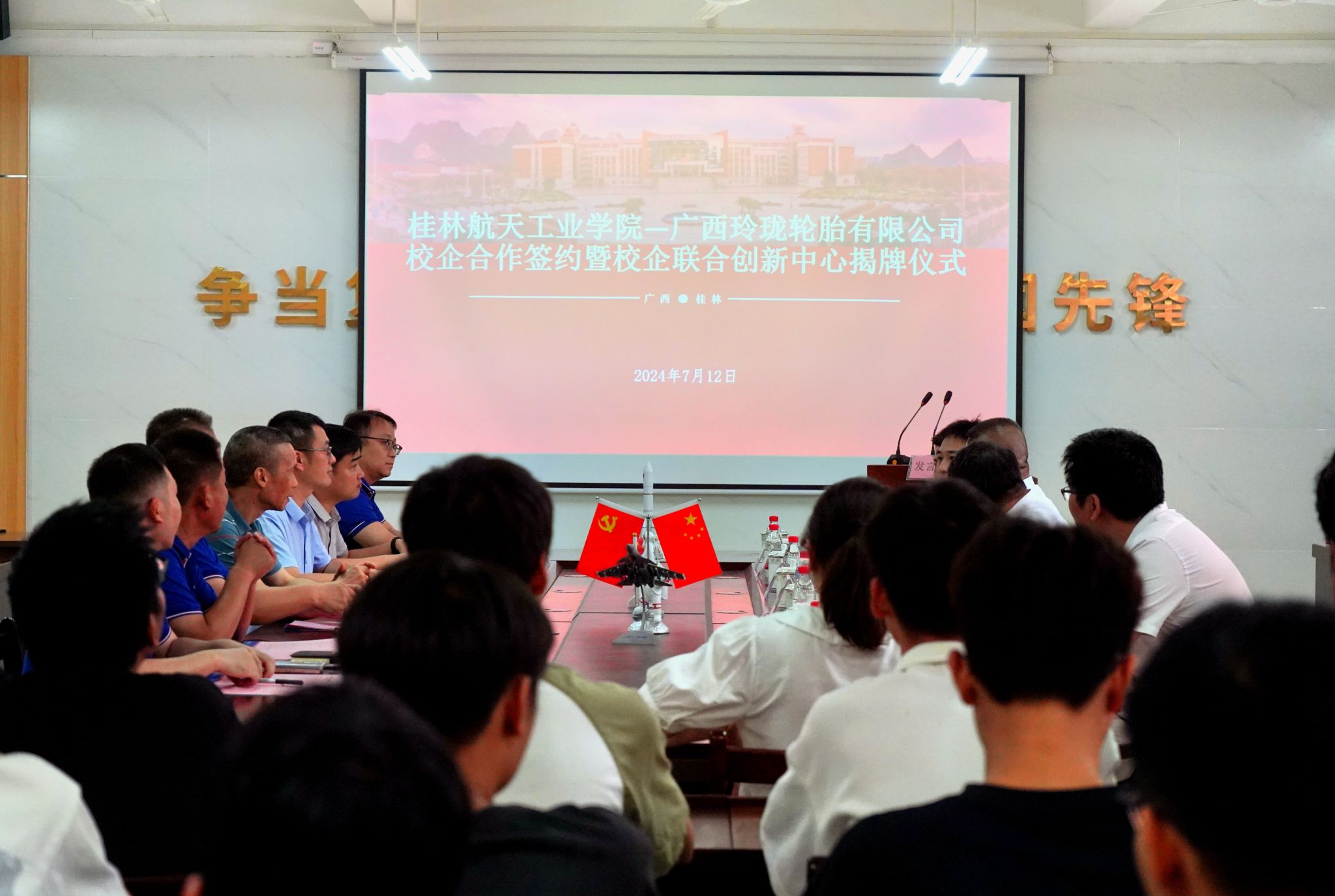 为推动产教融合发展,实现“共赢未来人才”“共享优势资源”“共建发展共同体”目标,助推校企双赢及高质量发展,7月12日下午,pp电子官方网站入口与广西玲珑轮胎有限公司校企合作签约暨校企联合创新中心揭牌仪式在巡天楼举行。柳州市科技局一级调研员郑晓鸿、柳东新区管委副主任黄敏、柳州市科技局农业农村与社会发展科技科科长周毓婷等政府领导,广西玲珑轮胎有限公司总经理杨科峰等企业代表,学校副校长张烈平,科技处负责人及机电工程学院负责人、80余名师生代表参加会议。