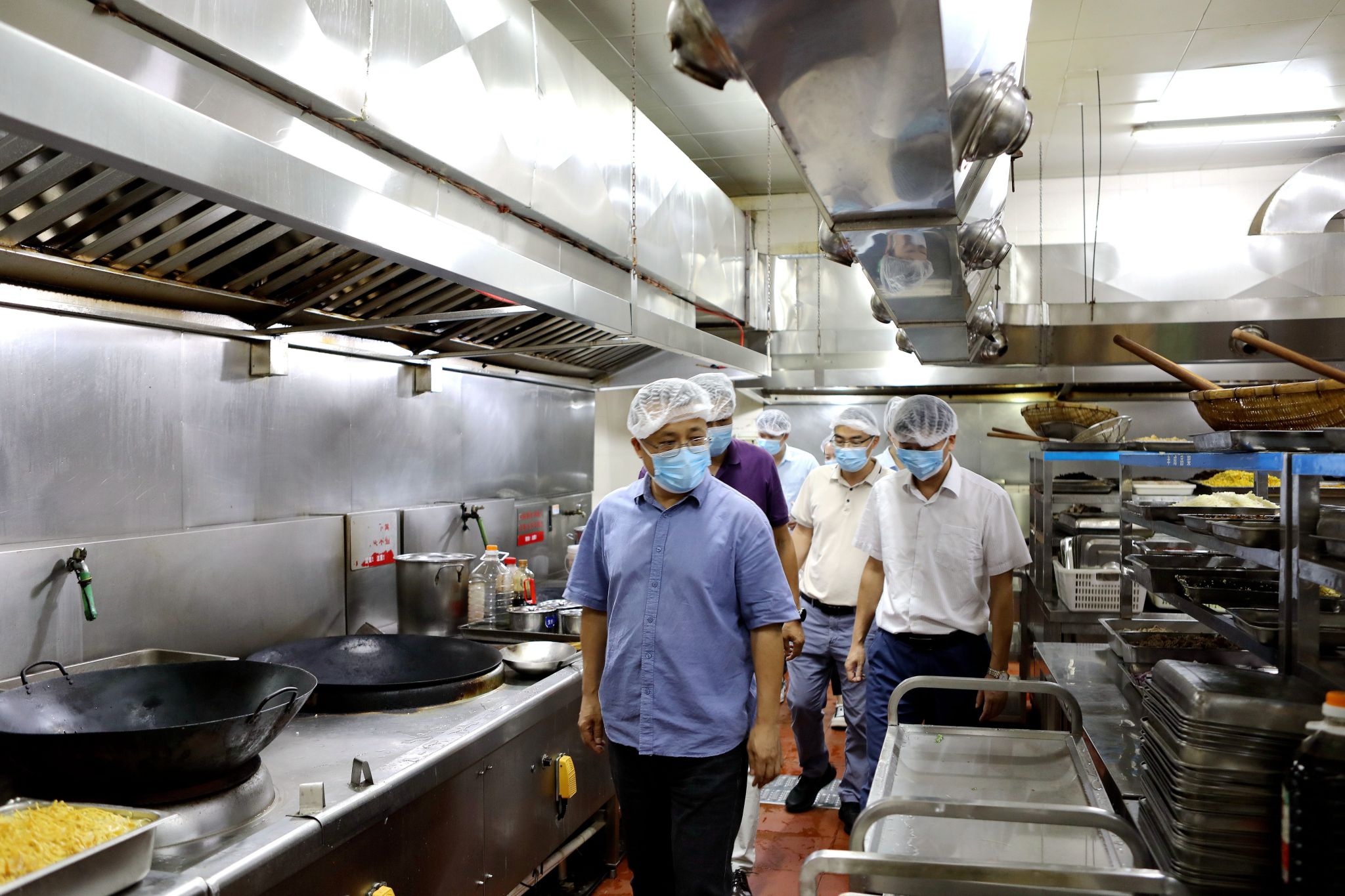 检查过程中,吴尽昭认真听取了当前学校食堂供餐工作情况的介绍,细致详细了解了学校食堂米、面、油及干杂配料等大宗物资的仓储及采购情况,并对食堂清洗间、切配间、面点间、蒸饭间、烹饪间等后厨操作间的食品卫生安全、消防安全等进行了深入检查。