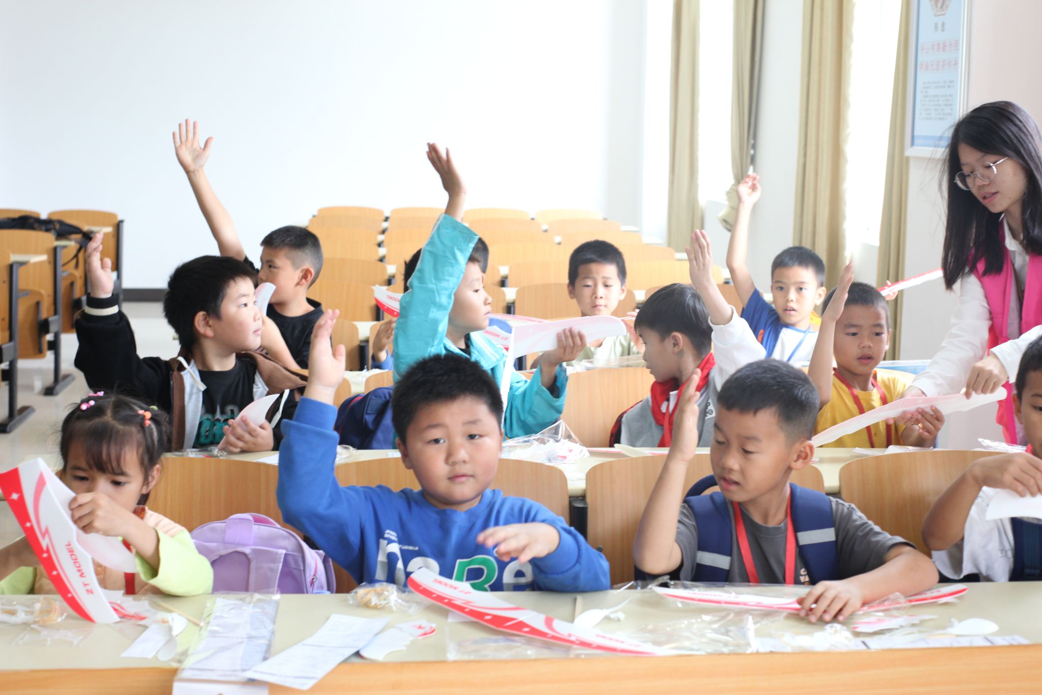 除了参观学习所外,同学们踊跃参与各项科技兴趣活动,在风雨足球场观看航模飞行表演时同学们欢呼雀跃;在航模制作理论知识学习时小朋友们专心致志;在教室动手制成橡皮筋飞机和纸飞机后他们开心自豪;在青春广场亲手放飞自己作品,小朋友们激情四射。
