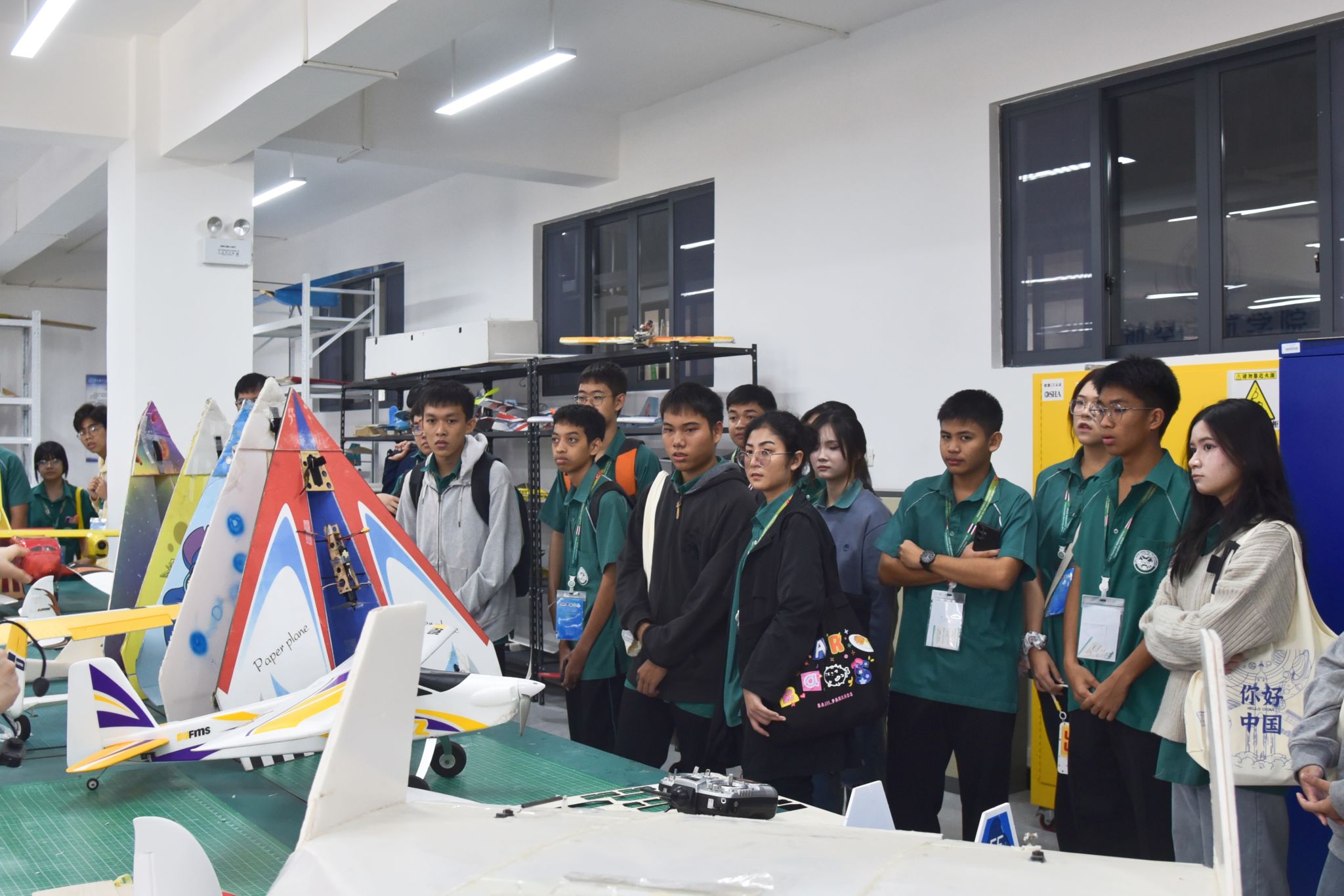 开班仪式结束后,泰国师生一行深入探访了航空航天工程实训教学中心、广西特种工程装备与控制重点实验室以及汽车工程学院实训教学中心,近距离了解了无人机类型、汽车构造和工程实验设备。同时,他们还观看了探天飞行表演队及航V大学生方程式车队带来的航模飞行表演和赛车演示,并体验了无人机飞行模拟操控,亲身感受了速度与激情的碰撞。