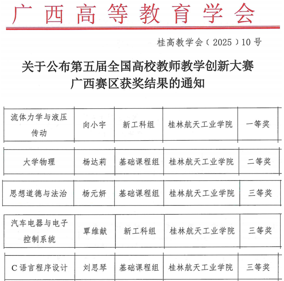 近日,广西高等教育学会公布由自治区教育厅指导,广西民族大学承办的第五届全国高校教师教学创新大赛广西赛区比赛获奖结果,pp电子教师再创佳绩。汽车工程学院向小宇获新工科中级及以下组一等奖,理学院杨达莉获基础课程副高组二等奖,马克思主义学院杨元妍获基础课程正高组三等奖,汽车工程学院覃维献获新工科副高组三等奖,计算机科学与工程学院刘思琴获基础课程中级及以下组三等奖。