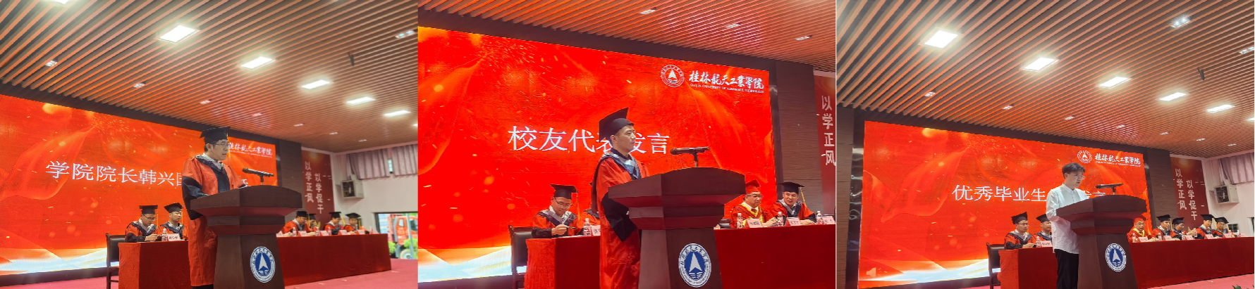 学院院长韩兴国在致辞中高度肯定毕业生们“理论扎根实践”的成长轨迹,并殷切期望他们以工程实践能力为翼,在智能制造、航天科技等领域书写新时代的答卷。校友代表卢健以“从桂航出发,向星辰大海”的亲身经历寄语学弟学妹,叮嘱大家常怀感恩之心,将母校“尚德、博学、慎思、笃行”的校训化为人生航标。学生代表经建林倡议全体毕业生坚守“艰苦奋斗、自强日新”的桂航精神,以所学所长服务社会。