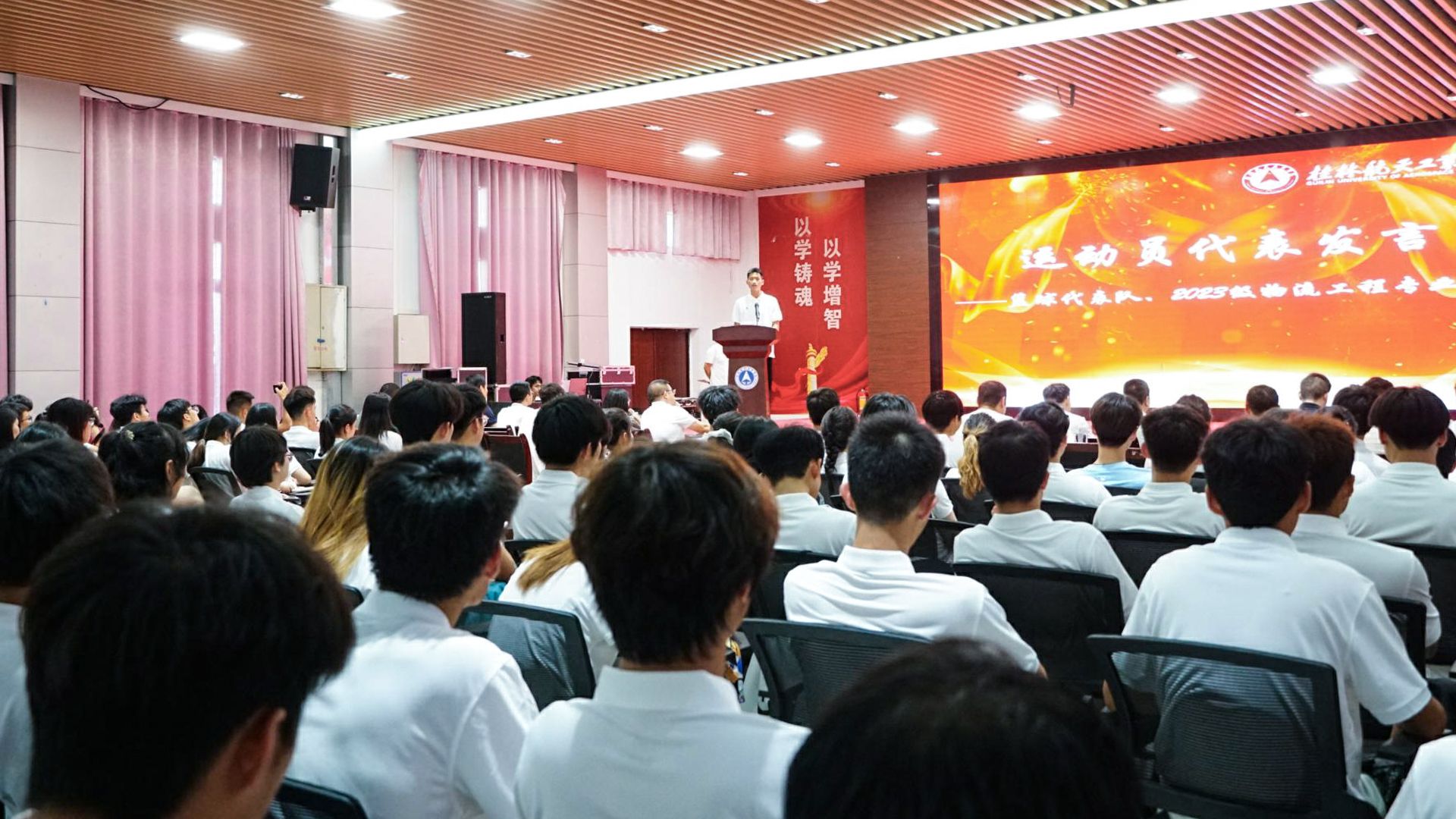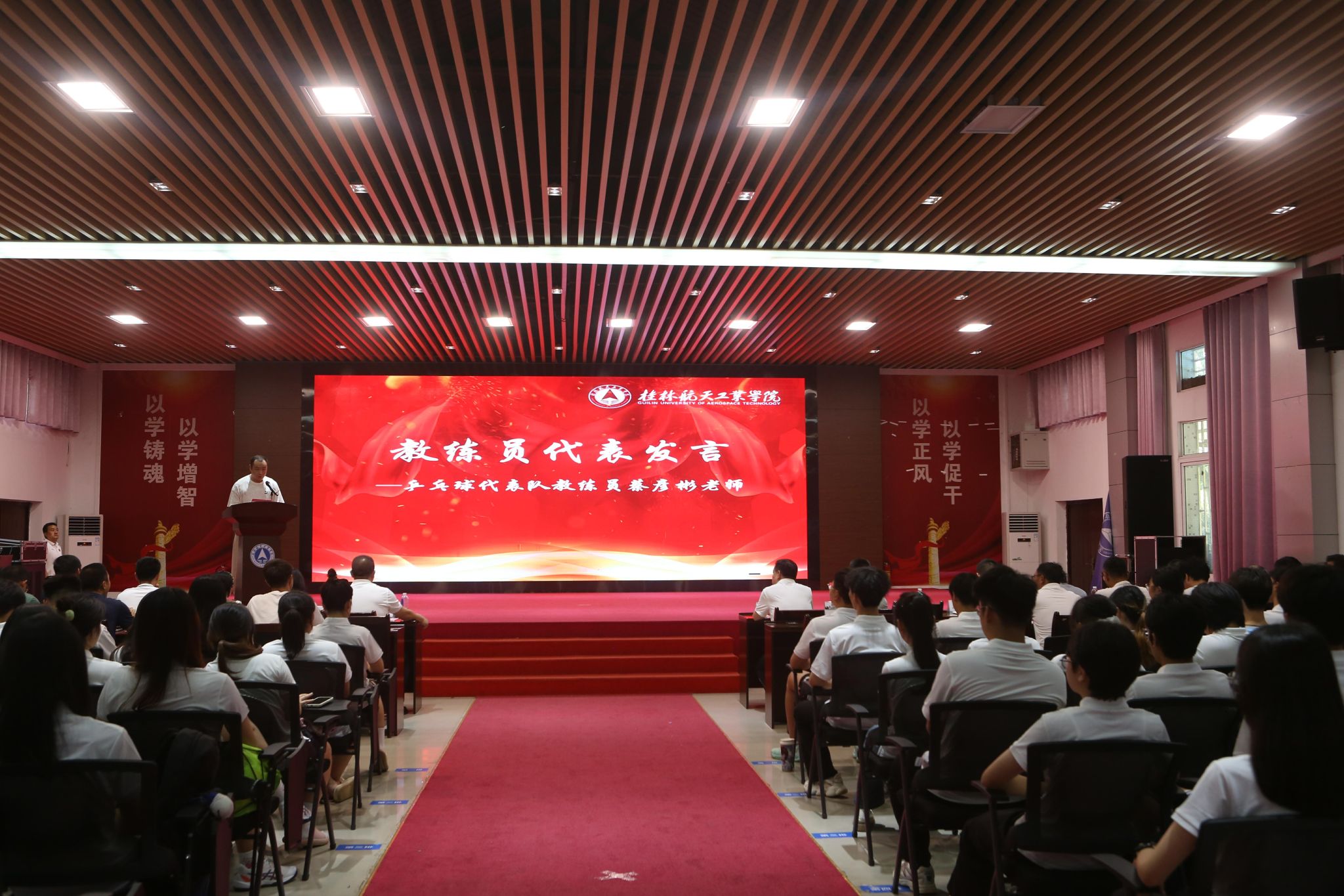 2025年7月3日,广西壮族自治区第十四届学生运动会代表团出征仪式在北校区招聘大厅隆重举行。学校党委副书记、体育运动委员会主任孙山林,学工部(处)、教务处、校团委、体育部及各学院分管学生工作负责人,全体代表队教练员、运动员参加活动。