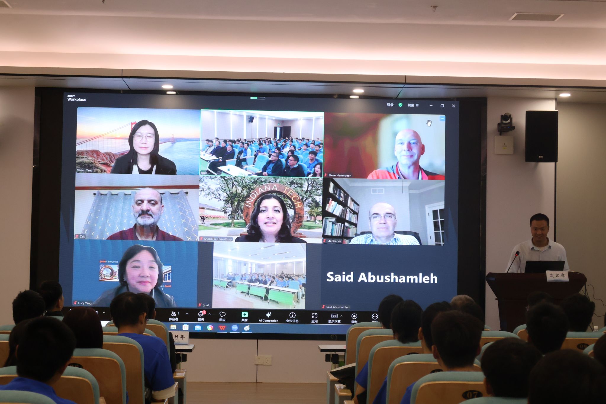 美国印第安纳理工学院副校长Steve Herendeen、工程与计算机科学学院院长Lucy Yang和电气工程学院教授兼主席Zakariya Al-Hamouz、国际招生与服务执行主任Sharmila Chowdhury分别发表视频讲话,从校情、专业结构、学院实验室及学习模式等方面进行了简要介绍了办学特色,鼓励同学们享受学习旅程中的机遇与挑战,成为具有全球竞争力的工程专业人才,为未来世界做出卓越贡献。