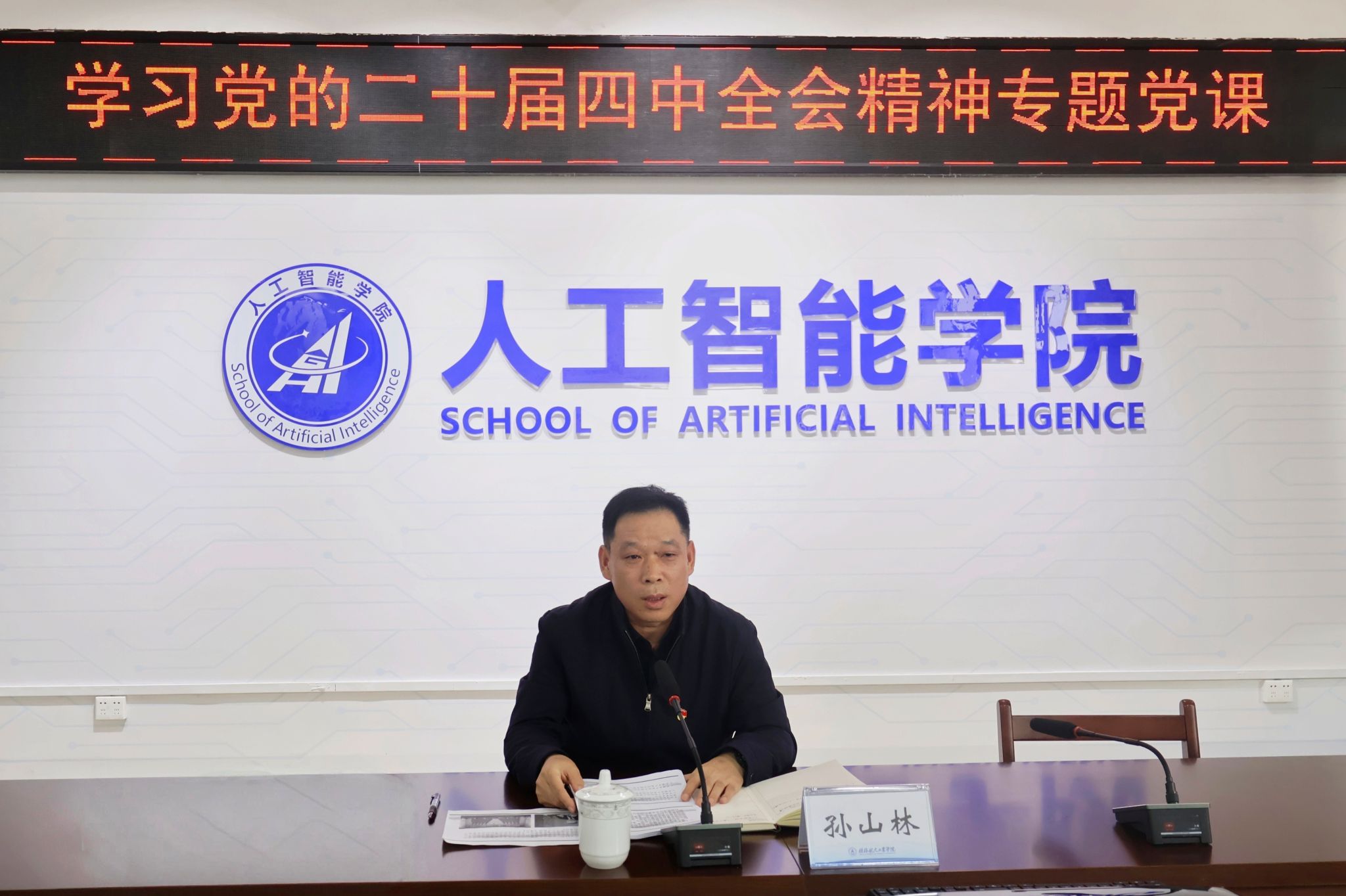 为推动党的二十届四中全会精神在师生群体中落地生根,引导师生精准把握全会核心要义,将个人成长融入国家发展大局,11月25日下午,校党委副书记孙山林为人工智能学院师生讲授专题党课。党课由学院党委书记主持,学院党委委员、教师代表、学生党支部书记、全体学生党员参加学习。