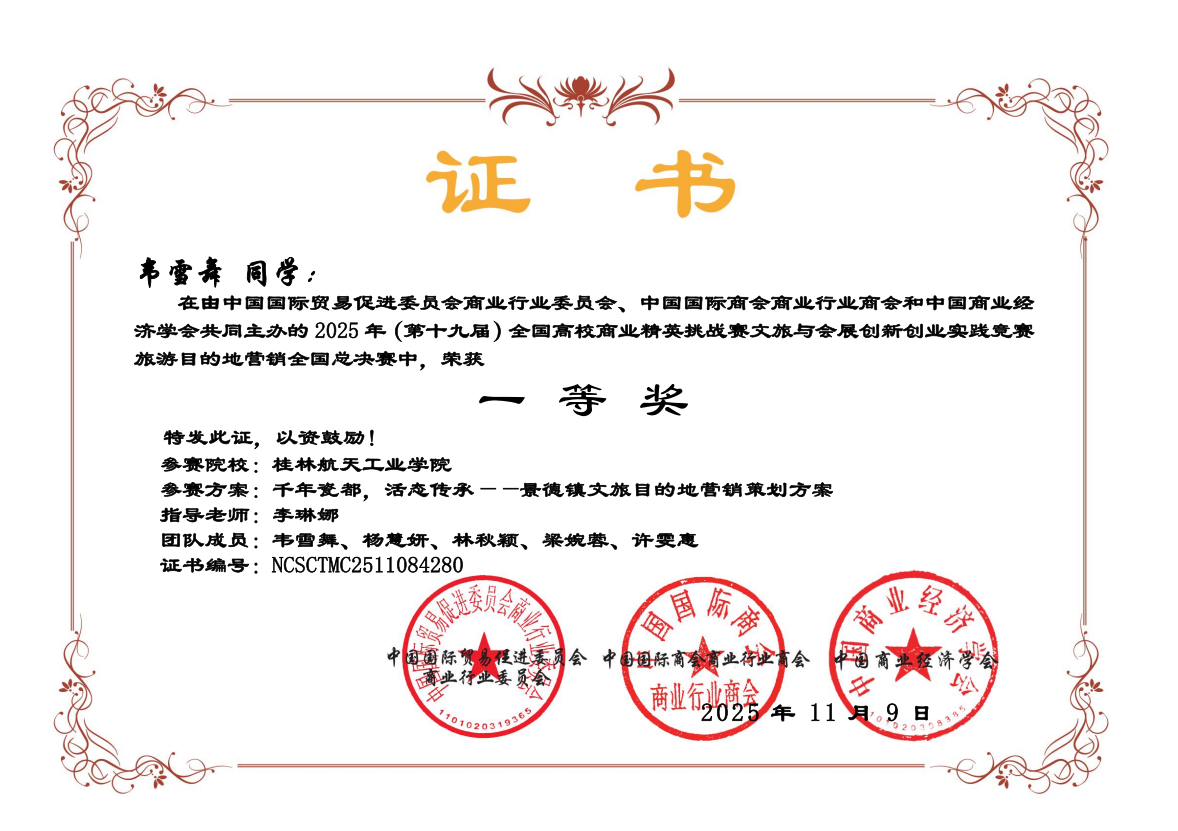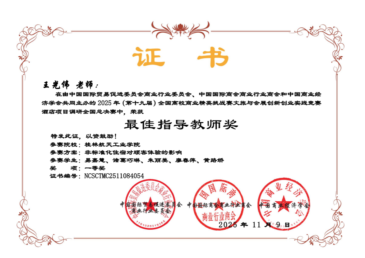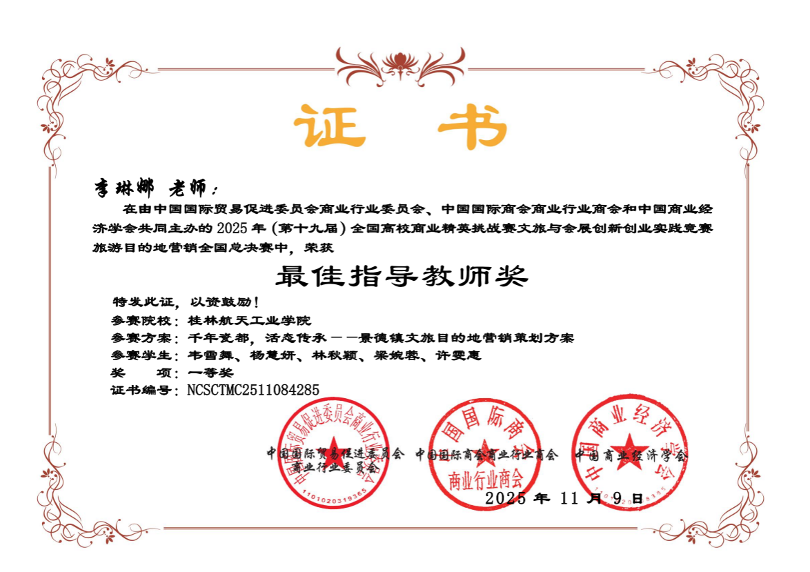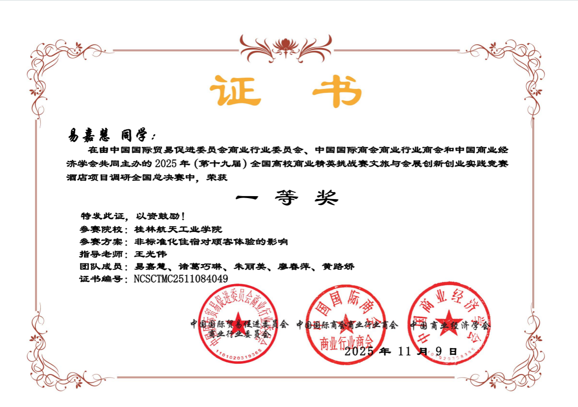 本次比赛由中国国际贸易促进委员会商业行业委员会、中国国际商会商业行业商会和中国商业经济学会联合主办,涵盖文化旅游竞赛、会展竞赛、酒店专业竞赛、文创产品设计等多个赛项。pp电子参赛学生凭借扎实的专业基础知识、卓越的团队协作能力,在指导老师的悉心指导下,经过“知识赛-广西区赛-全国总决赛”的层层选拔与角逐,与众多高校参赛队伍同台竞技,最终取得学校参赛以来最好的成绩。其中,一等奖作品《非标准化住宿对顾客体验的影响》《千年瓷都,活态传承——景德镇文旅目的地营销策划方案》经过一年多的打磨,深入实践调研,将专业理论与创意方案紧密结合,不负众望获得佳绩。