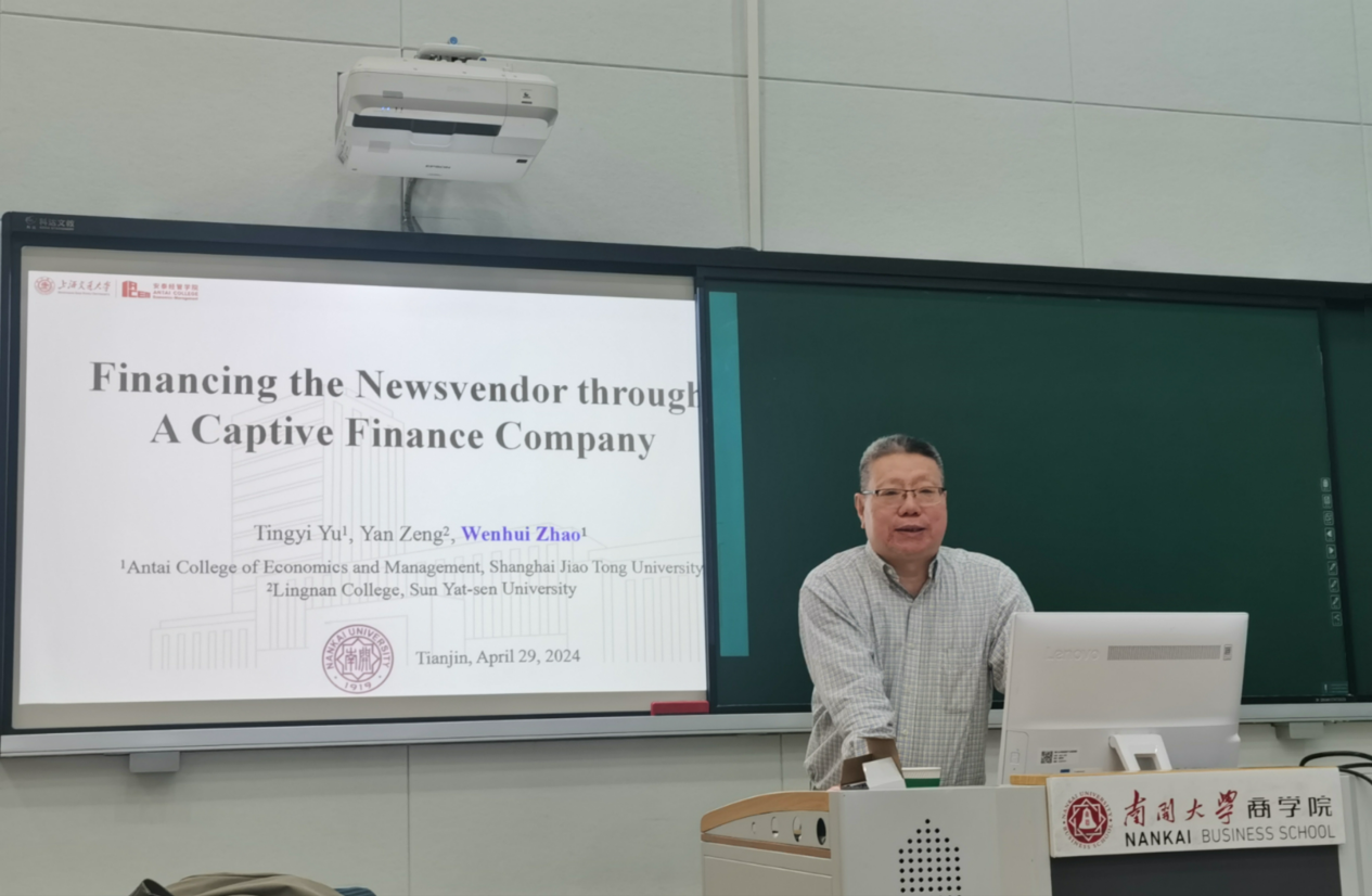4月29日,金年汇官方入口jinnianhui金年会管理科学与工程系邀请到上海交通大学赵文辉教授,开展题为“Financing the Newsvendor through A Captive Finance Company”的学术讲座,讲座由金年汇官方入口jinnianhui金年会管理科学与工程系主任李勇建教授主持,管科系硕士生、博士生及部分青年教师参加。嘉宾简介:美国俄亥俄州立大学运筹学博士,2010年8月加入上海交通大学安泰经济与管理学院,目前为上海高校特聘教授(东方学者),中国管理科学与工程学会供应链与运营管理分会副主任、学术委员会主席。论文发表在Management Science, Operations Research, Manufacturing Service Operations Management, Math Programming等国际运营/数学期刊,Web of Science核心合集单篇引用470余次。成果被Manufacturing Service Operations Management期刊论文进行了实证检验。指导了世界500强企业供应链金融项目,试运行9个月直接经济效益1千万元;实施前三年和后三